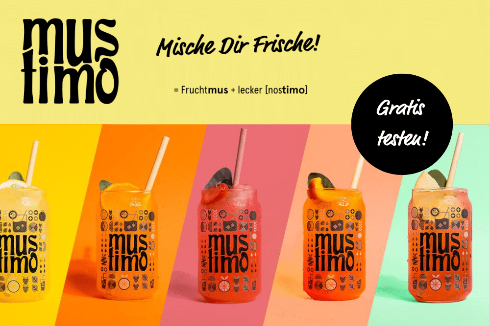 Mit der „frischen Mischung“ des griechischen Wortes für lecker – nostimo – und dem deutschen „Mus“ ist das gelungen. Das Unternehmen hat die Namensgeschichte sogar gleich als Formel in den Claim gepackt: Fruchtmus + [nostimo] (griech. lecker) = mustimo! Mische dir Frische! So wird der Name auf den ersten Blick erklärt und bleibt sofort im Kopf. Das knallige Design tut sein übriges.